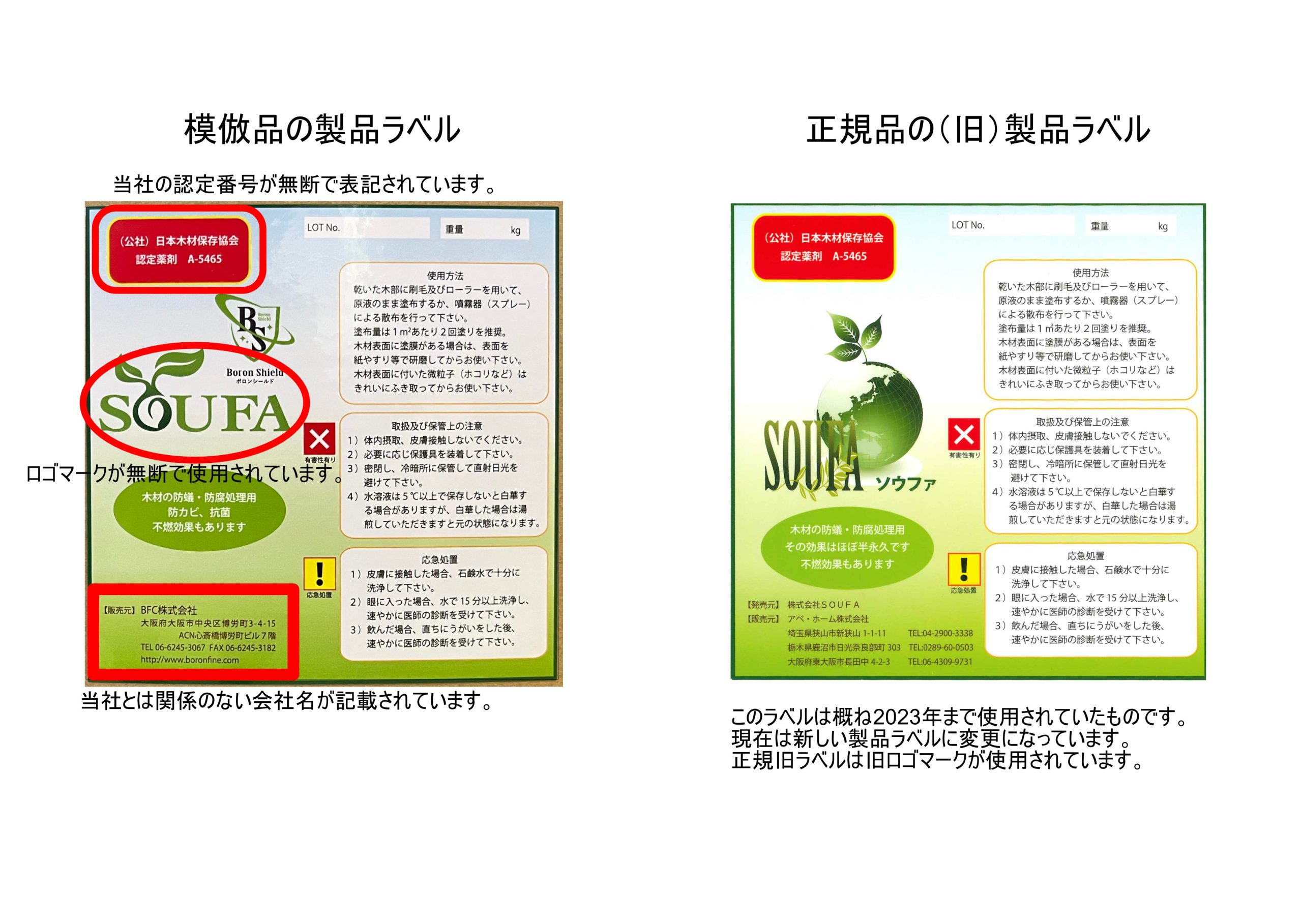 The various data, including SOUFA’s anti-termite test data and anti-termite certification numbers (A-5465, A-5470), listed on the BFC Corporation website and presented in materials used by the company for sales, etc., are our company’s data or certification numbers. BFC Corporation manufactures and sells these products with labels that are mistakenly believed to be the performance of its own products.